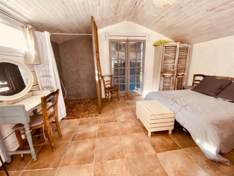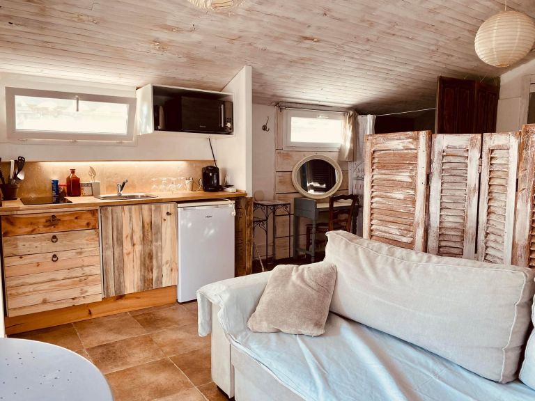 Studio de 25 m2 avec 5 couchages, 1 grand lit, deux lits superposés et un grand lit simple. Douche à l'italienne accessible aux personnes à mobilité réduite.