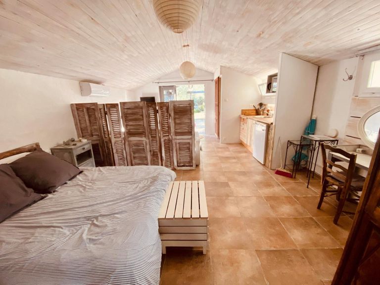 Studio de 25 m2 avec 5 couchages, 1 grand lit, deux lits superposés et un grand lit simple. Douche à l'italienne accessible aux personnes à mobilité réduite.